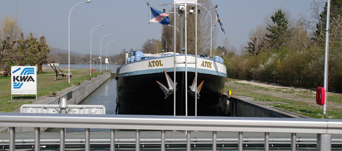 Auf der Augster Seite befindet sich die oberste Grossschifffahrtsschleuse am Hochrhein. Sie ist 110 m lang und 12 m breit und ermöglicht den Schiffen die Weiterfahrt bis zur Brücke in Rheinfelden. Benutzt wird die Schleuse von Personenschiffen, von Frachtschiffen, welche die Entladestellen an den beiden Rheinufern bedienen und von privaten Sportbooten. Die Schleuse wurde gleichzeitig mit dem Kraftwerk vollständig erneuert und ausgebaut. Eine Fernsteuerung ermöglicht die Bedienung der Schleuse von Birsfelden aus. Die Schleuse wird durch KWA unterhalten; die Kosten teilen sich ED und KWA.